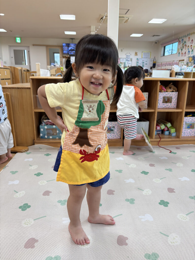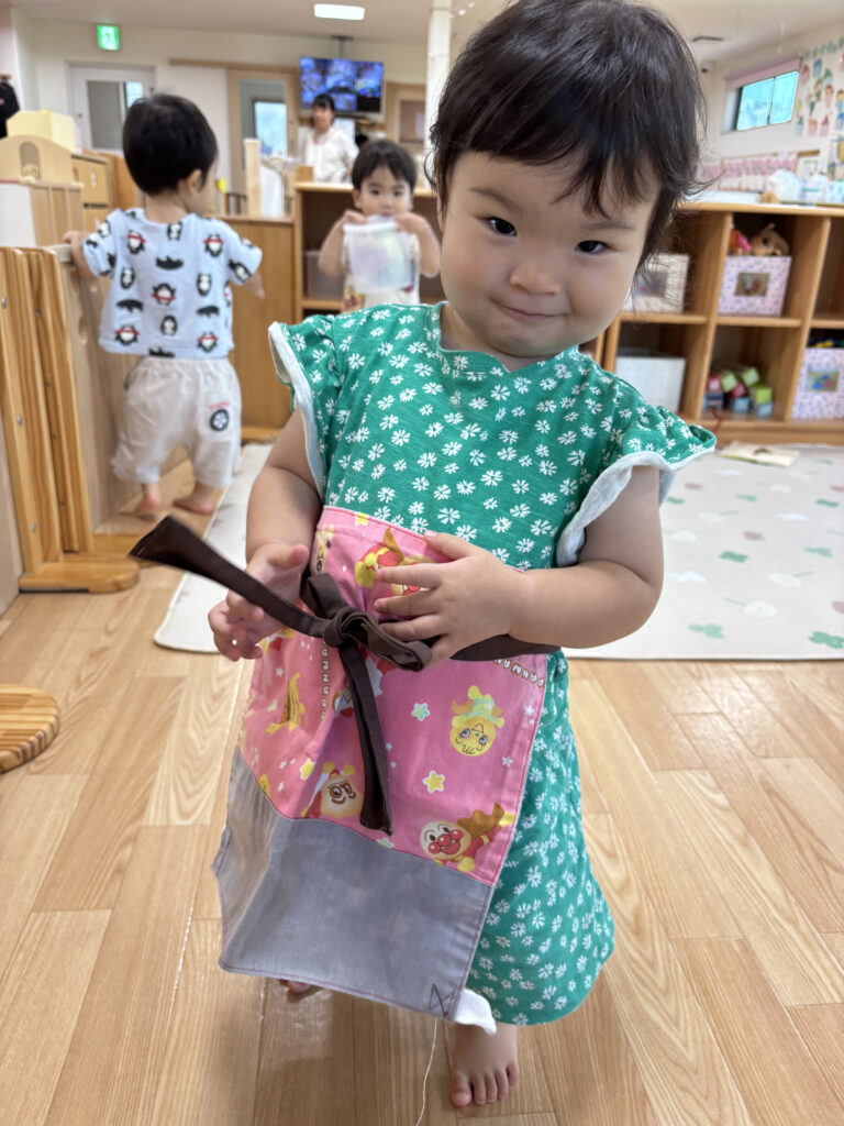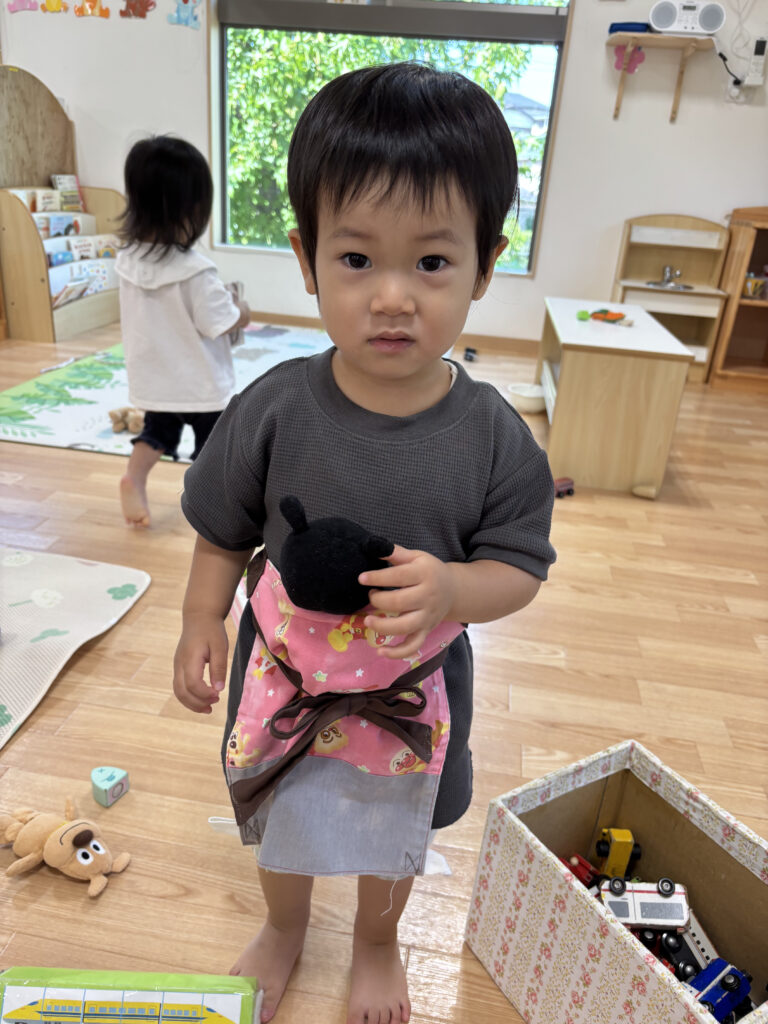 大人気アイテムの布エプロン!お腹につけたり、おんぶひものように使ったりと様々な使い方であそびを楽しんでいます。